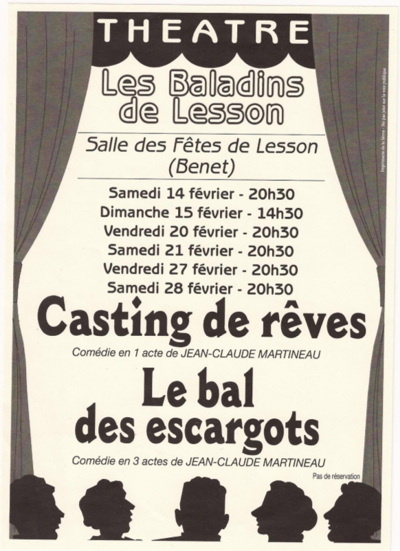 La SEP de LESSON et ses "Baladins" présente cette année encore une pièce "Le bal des escargots" dans laquelle Yvon joue le rôle d'un futur jeune marié, Flavien ! Mais tout ne se passe pas comme prévu.... et il s'en suit des embrouilles à découvrir :